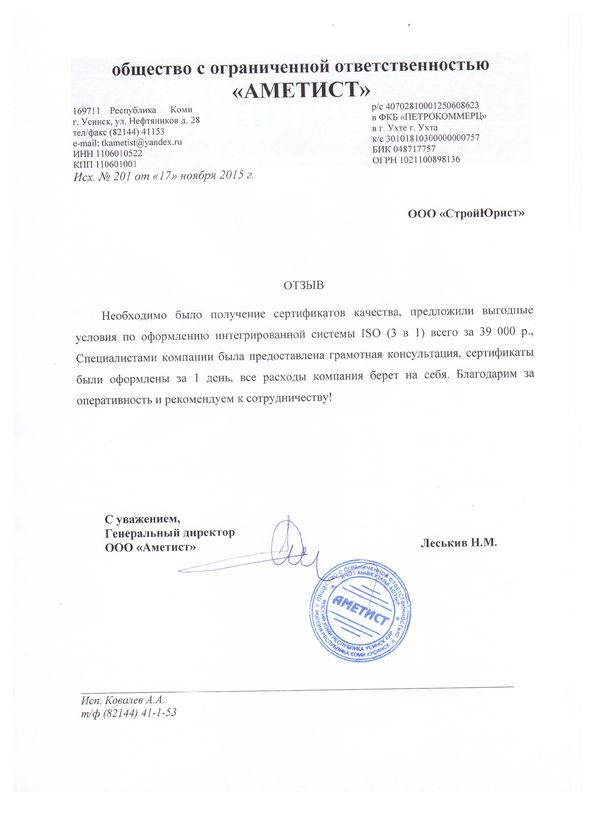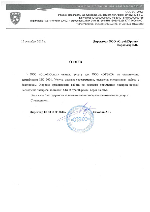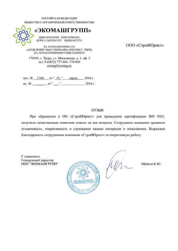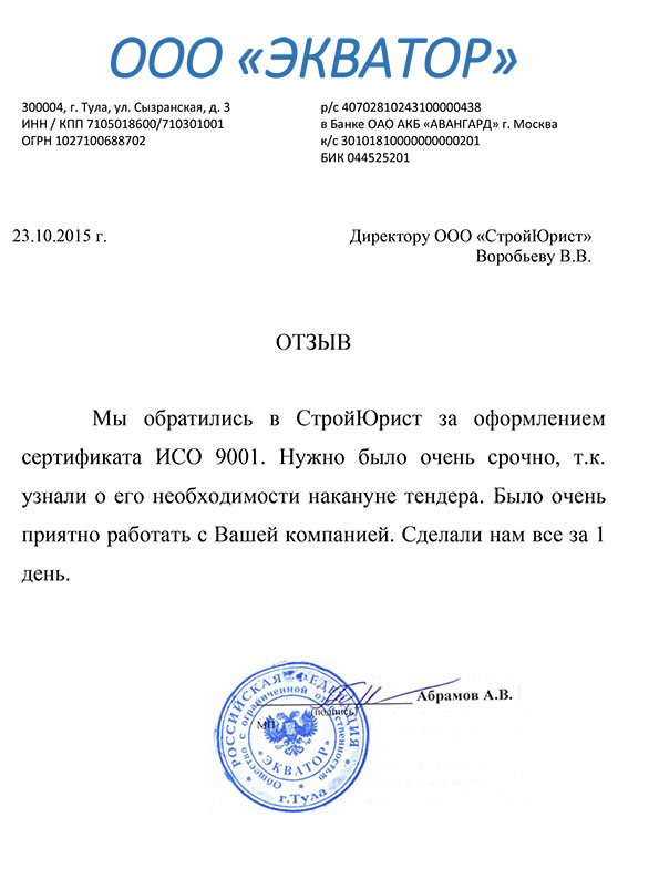 Отзывы клиентов "СтройЮрист" по ISO в Колпино